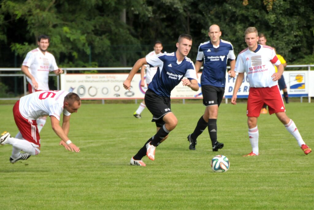 Kevin Hartmann am 29.08.2015 im Punktspiel gegen den SV 1890 Westerhausen (1:1). Hinten ist hier auch S. Limpächer zu sehen.
