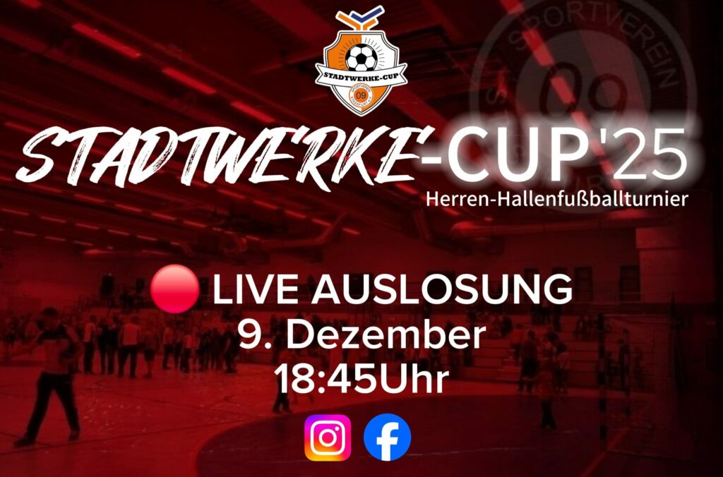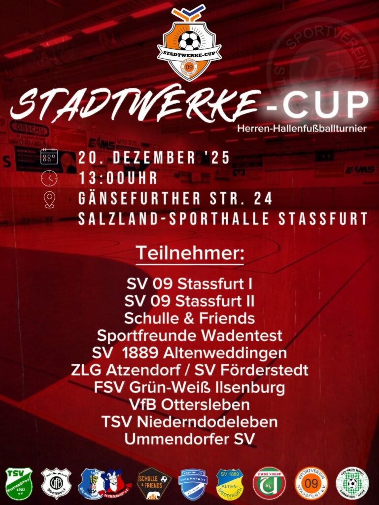 Heute um 18.45 Uhr wird die Auslosung der Gruppen für den diesjährigen Stadtwerke-Cup der Herren vorgenommen. Übertragen wird das Prozedere live auf den Social-Media-Kanälen des SV 09. Die 1. Auflage am 21. Dezember des Jahres 2024, noch einmal zur Erinnerung, gewann der Oberligist FC Einheit Wernigerode.