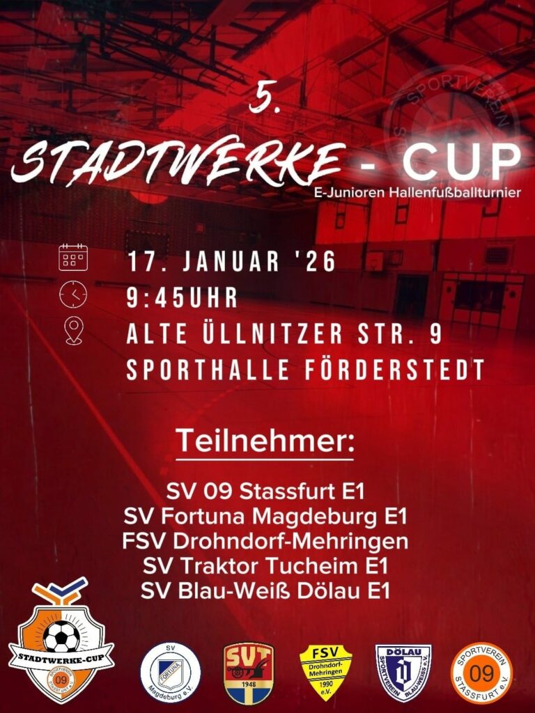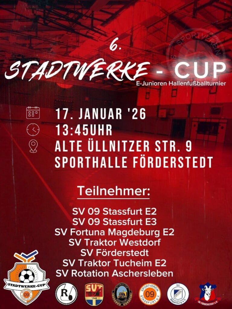 Am Samstag gibt es in der Förderstedter Sporthalle erneut eine Doppelveranstaltung. Um 9.45 Uhr findet der 5. Stadtwerke-Cup der E-Jugend statt, um 13.45 Uhr folgt für die gleiche Altersklasse gleich noch der 6. Stadtwerke-Cup. Während am Vormittag 5 Mannschaften um den Turniersieg spielen, sind es am Nachmittag 6 Teams. Ursprünglich waren es hier sogar 7, aber die 3. E-Jugend des SV 09 Staßfurt startet nicht. Gespielt wird jeweils im Modus Jeder gegen Jeden, so dass die Veranstaltung circa bis 18.00 Uhr geht.