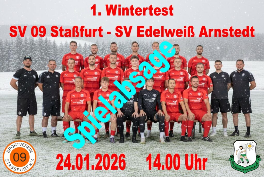 23. Januar 202623. Januar 2026 Spielabsage Wie Philipp Schmoldt soeben mitteilte, fällt das morgige Testspiel der 1. Mannschaft gegen den SV Edelweiß Arnstedt aus. Der Platz ist nicht bespielbar. Beitrag teilen